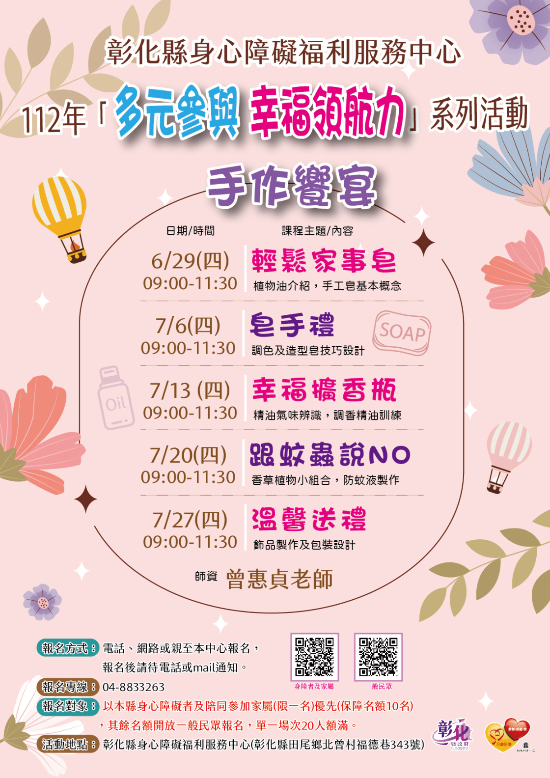 報名對象:以本縣身心障礙者及陪同參加家屬(限一名)優先(保障名額10名,以報名順序),其餘名額開放一般民眾報名。